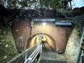 | 日出駅の連絡通路として現役使用されている 江戸切りされた輪石10個、要石で構成される 迫受石はない 白塗りされているが、煉瓦アーチであることは判 別できる 側壁と坑門は駅の施設として改修されていると 思われる 江戸切りされた笠石がある 2025年12月訪問 |