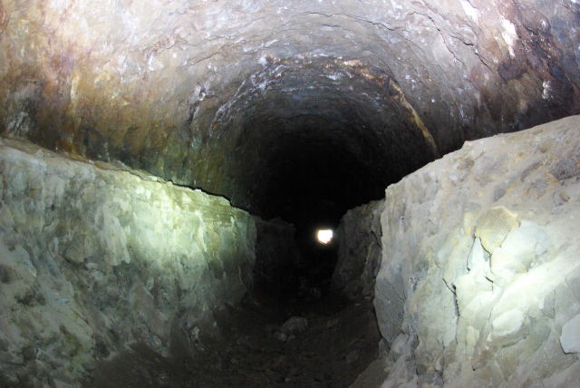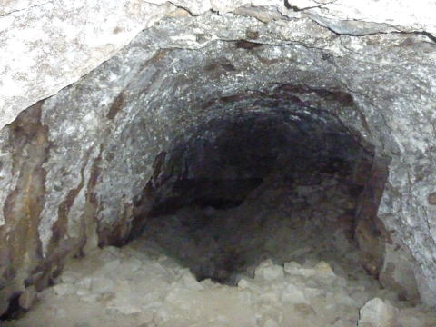 一方のこちらが正面の坑道。 これも東側横坑と思われます。 ちょうど斜坑に向かう坑道を避ける 形でコの字型に東坑を曲げたのでは ないでしょうか。 |