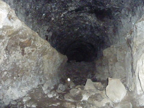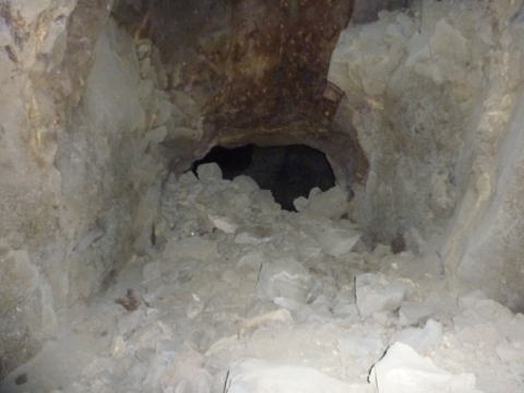 坑道は一気に窄まり、さらに瓦礫で 覆われてしまっています。 向こう側は東側横坑のはずですん で、寸前まで拡幅していたんですね え。 |