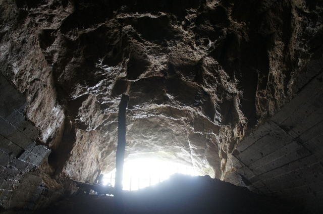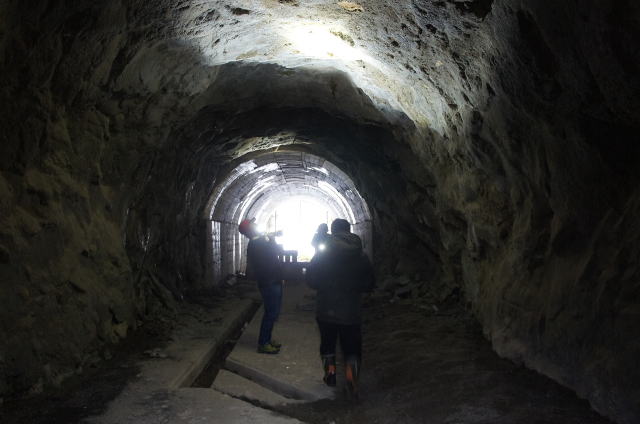 ![]() 最深部より振り返り。 このような感じで洞内が掘りあがっているのが分かって頂けると思います。 本坑を見下ろすような感じになっています。 |