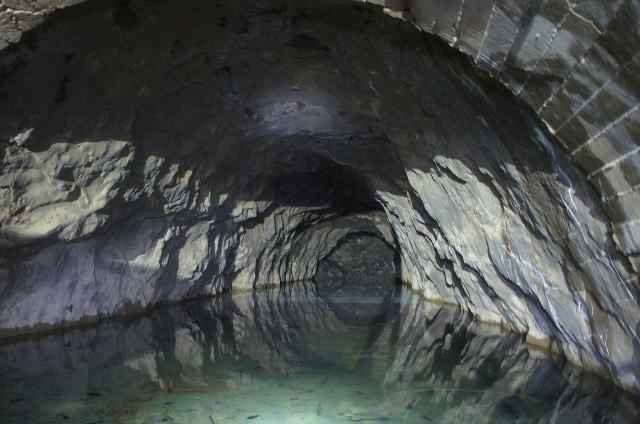![]() 水面に映る素掘りの洞内。まるでまん丸の坑道かのようです。 そしてA坑、B坑以外の、あのスカスカコンクリ巻きよりもずっと安心感があります。 …それでは入水… |