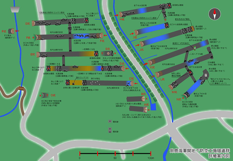 ![]() 2011年10月に一旦完了した鈴鹿海軍関地下防空工場隧道群探索。 実は僅かに未踏査ポイントが残っています。 まずはA抗。ここは鉄格子に施錠付きで内部の探索ができませんでした。しかしながらピカさんの1000ルーメンライトにて閉塞は確認しております。 そしてB坑。ここも鉄格子&施錠にて探索不能。ここもピカライトによって閉塞は確認しております。 で、I坑。ここは膝丈以上の水没(ウェーダー導入前だったこともあり)にて即時撤退。 ここはとのたまさん、パパンさんによって奥の状況は一応分かっております。 さらにO坑。ここは斜坑になっており、危険な状態なので今回も見合わせます。 2015年2月、今回は自称4000ルーメンのヘッドライトを導入したことを受けて、再度A坑、B坑、I坑のチェックを致します。 |
